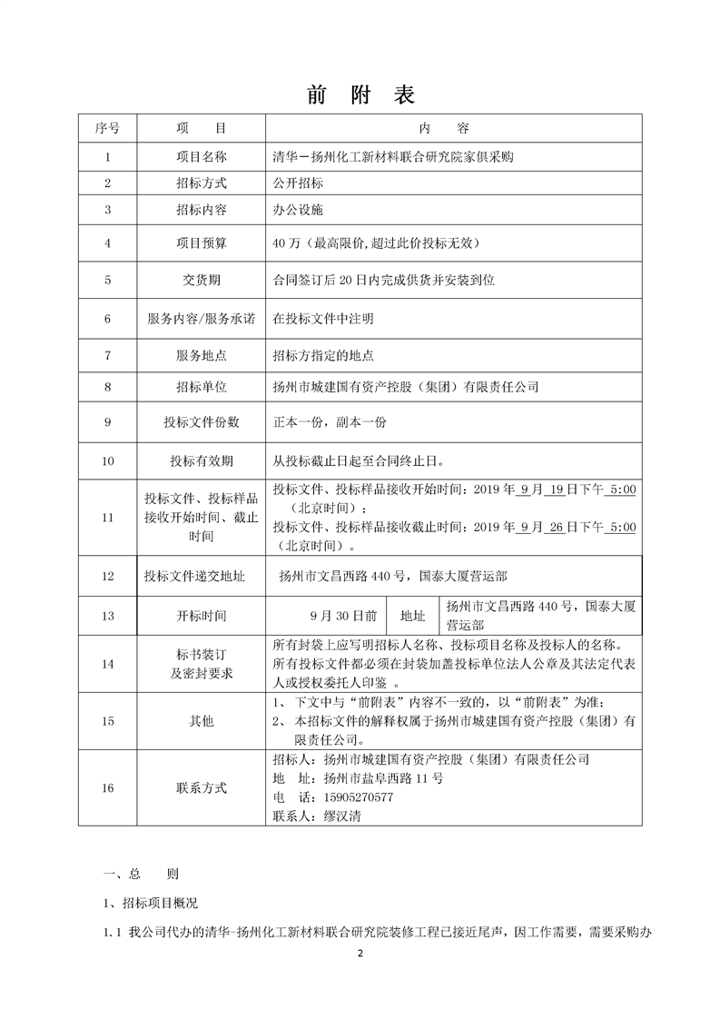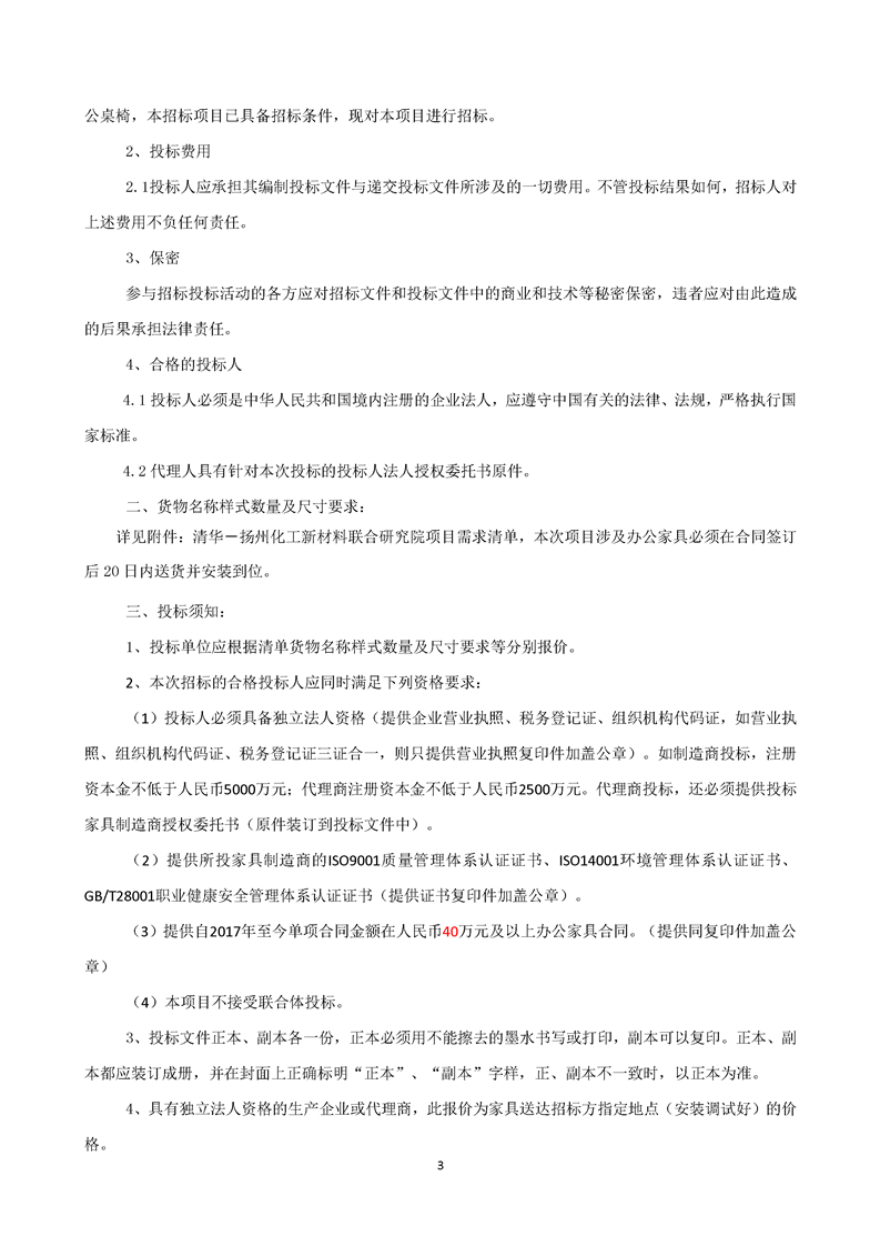 清華-揚州化工新材料聯(lián)合研究院家俱采購招標文件