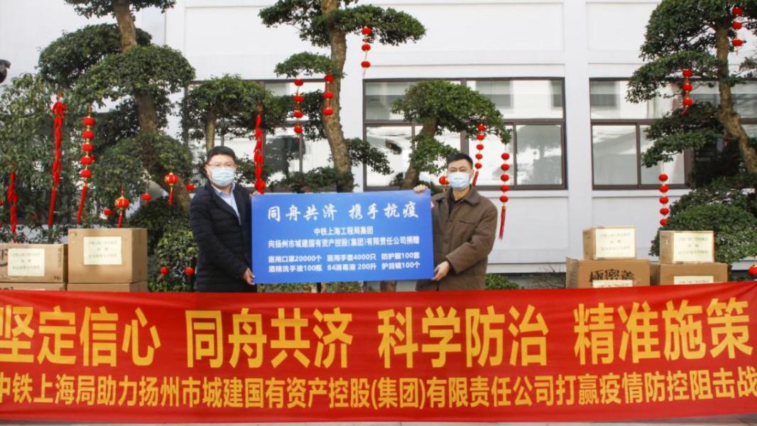 捐贈(zèng)儀式上,中鐵上海工程局集團(tuán)華海公司共向城控集團(tuán)捐贈(zèng)醫(yī)用口罩20000個(gè)、醫(yī)用手套4000只、防護(hù)服100套、酒精洗手液100瓶、84消毒液200升、護(hù)目鏡100個(gè)。