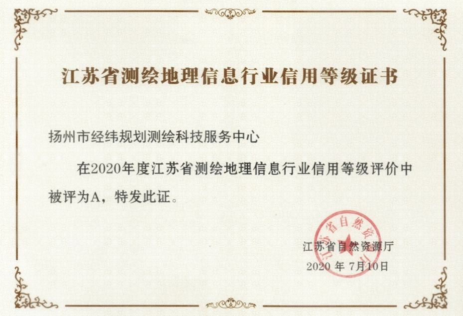 經(jīng)緯測(cè)繪中心榮獲2020年度江蘇省測(cè)繪地理信息行業(yè)A級(jí)信用