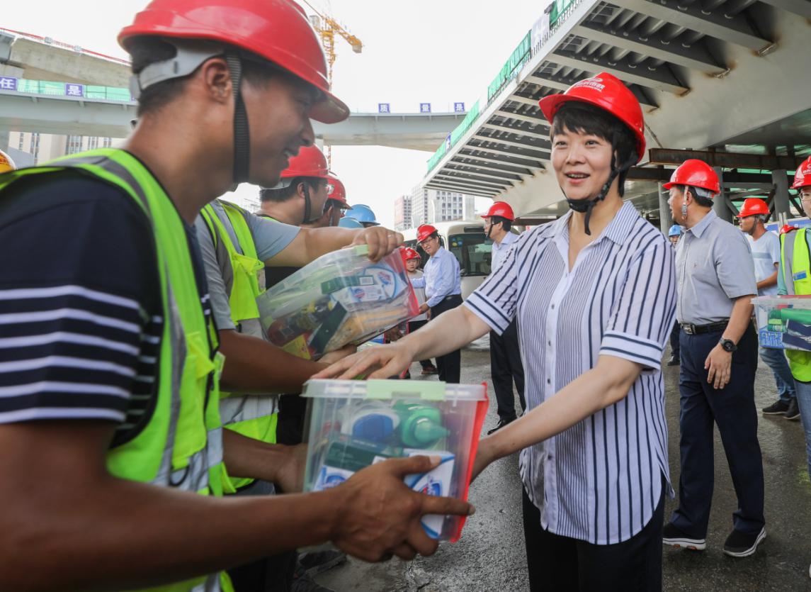 張寶娟一行實地察看了國泰創(chuàng)新中心、潤揚快速路、長江水務(wù)和揚州古城保護成果展示館,詳細了解項目建設(shè)情況。在潤揚路快速化改造工程江陽路互通立交施工現(xiàn)場,張寶娟給一線的工人們送上防暑物品。她囑咐企業(yè)負責(zé)人,高溫下連續(xù)工作非常辛苦,要確保高溫天氣作業(yè)安全和工程質(zhì)量,科學(xué)合理安排工時,做好防暑降溫工作,確保如期完成工程建設(shè),早日惠及揚州人民。