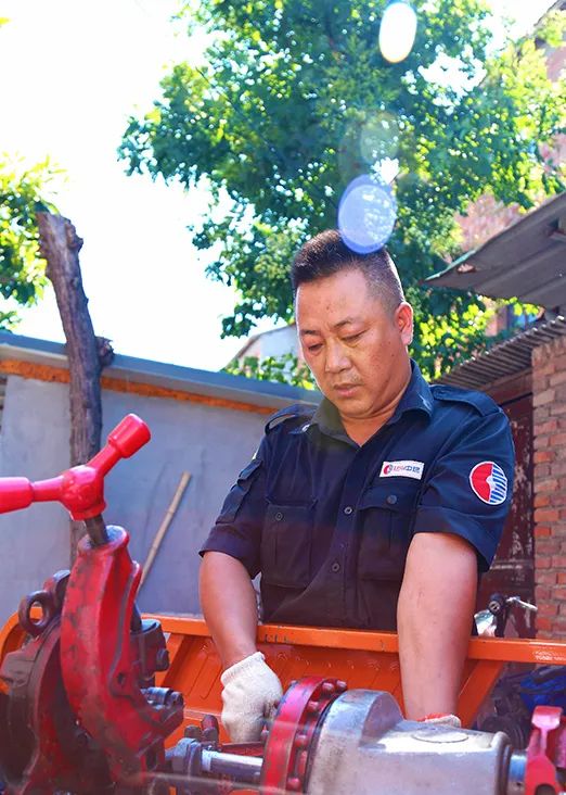 8月18日,為避開高溫天氣,管道安裝工仲飛清晨5點多準時到達駐點,和伙伴們完成備料備件后,迎著朝霞趕赴揚州老城區(qū)北講經墩居民家中。由于完全是戶外曝曬作業(yè),他身上的工作服濕了又干,干了又濕,泛起層層白色鹽霜。