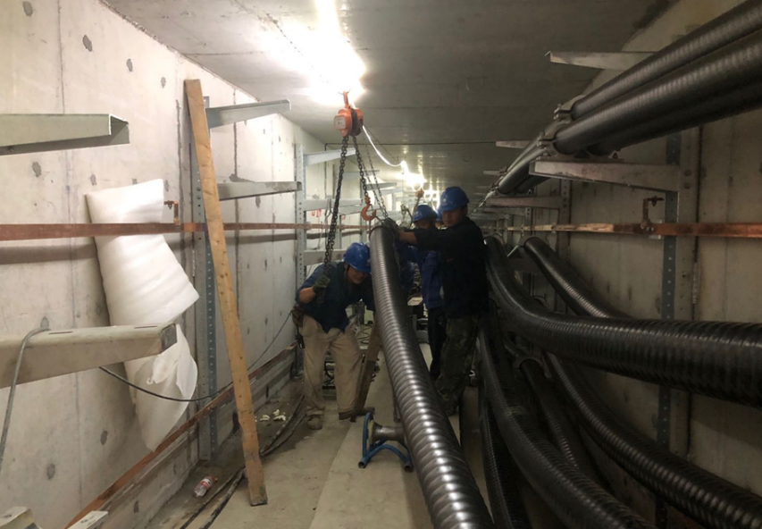 因高壓線不能滿足萬福快速路建設的安全距離,萬??焖俾?/span>220KV電力管廊工程于今年5月1日進場施工,整個電力線路遷改工程包括新建地下電纜隧道、電纜溝總計約1676米,需對3條次110千伏電力線路和4條次220千伏電力線路實施遷改,將原先萬福快速路范圍內(nèi)架空線路全部下地安裝在電纜隧道內(nèi),施工難度大、技藝要求高,是揚州首次開展如此規(guī)模的電纜下地工作。目前電纜隧道主體工程已經(jīng)完工,正在進行電纜下地施工。