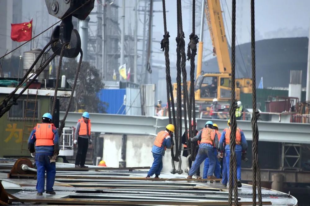 跨京杭運(yùn)河大橋施工采用“先拱后梁”的順序。拱肋的安裝看似空中搭積木,實(shí)則困難重重。每塊鋼結(jié)構(gòu),都要先于武漢加工制作基地制成小節(jié)段后經(jīng)水上運(yùn)輸至泰州拼裝基地,在泰州完成預(yù)拼和加固焊接成大吊裝節(jié)段后才抵送施工現(xiàn)場。為確保大橋安全高效施工,項(xiàng)目部克服了高空吊裝施工難度大、安裝精度要求高、施工安全風(fēng)險(xiǎn)高、封航時(shí)間限制等困難,嚴(yán)格按照標(biāo)準(zhǔn)化施工規(guī)范要求,精心組織,強(qiáng)化管理,狠抓工序銜接,逐一擊破難點(diǎn),確保工程整體有序推進(jìn)。