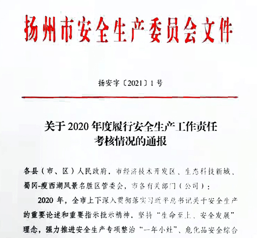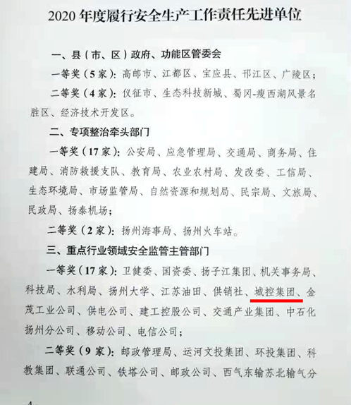 2020年,城控集團深入貫徹落實習(xí)近平總書記關(guān)于安全生產(chǎn)重要論述,堅持“生命至上、安全發(fā)展”理念,強力推進(jìn)安全生產(chǎn)專項整治,創(chuàng)新工作舉措,順利完成市安委會下達(dá)的目標(biāo)任務(wù),為揚州市全年事故起數(shù)和死亡人數(shù)大幅“雙下降”貢獻(xiàn)城控力量,被市安委會表彰為2020年度履行安全生產(chǎn)工作責(zé)任先進(jìn)單位一等獎。