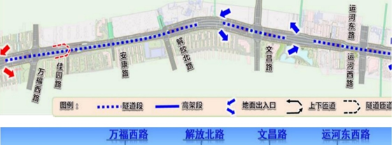 運(yùn)河南北路快速化改造工程(施井路-二里橋路南)項(xiàng)目起自二里橋路南,終至施井路北,項(xiàng)目總長1440米,是整個(gè)運(yùn)河南北路快速化改造工程的關(guān)鍵節(jié)點(diǎn)工程。項(xiàng)目新建快速路雙向六車道,兩側(cè)地面輔路雙向六車道,與文昌中路、運(yùn)河西路交叉口采用下穿隧道方式穿越。其中,文昌中路隧道全長470米,暗埋段83米;運(yùn)河路隧道全長561米,暗埋段201米。項(xiàng)目建設(shè)對推進(jìn)揚(yáng)州城市發(fā)展、完善城市快速路網(wǎng)、緩解老城交通擁堵以及提升城市形象有著十分重要的作用。