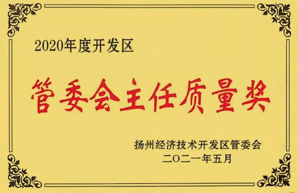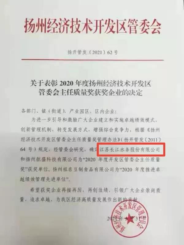 6月4日,揚(yáng)州市經(jīng)濟(jì)技術(shù)開發(fā)區(qū)召開全區(qū)質(zhì)量大會(huì),表彰在質(zhì)量管理方面取得突出成效的企業(yè)組織,長(zhǎng)江水務(wù)公司榮獲“2020年度開發(fā)區(qū)管委會(huì)主任質(zhì)量獎(jiǎng)”。