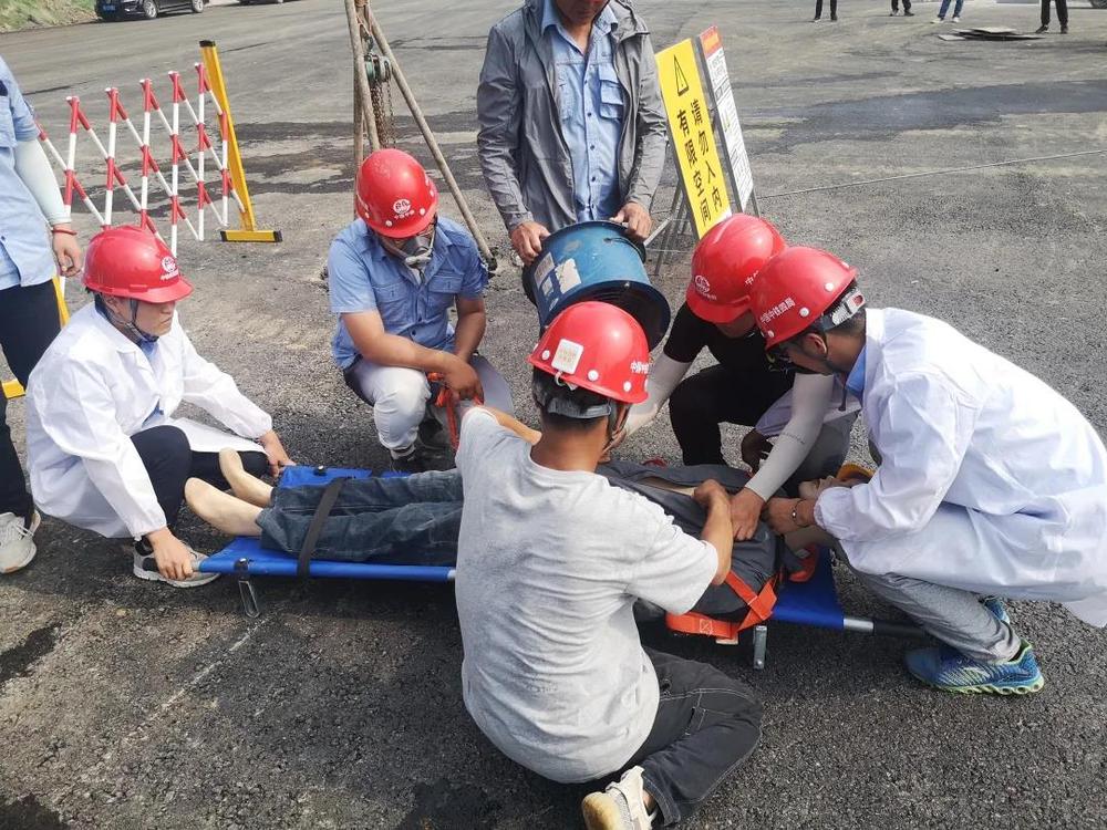 在一陣緊急呼救聲中,應急救援演練拉開序幕:現(xiàn)場模擬了施工人員在進行井下清淤工作時,由于設(shè)備內(nèi)含氧量不足,發(fā)生了窒息事故,隨即出現(xiàn)頭暈、昏迷情況,情況十分危急!施工安全員發(fā)現(xiàn)情況后,立即上報指揮長,請求相關(guān)部門協(xié)同應急救援。安全員立即對施工井內(nèi)有毒有害氣體進行檢測,符合下井作業(yè)標準;救援人員迅速佩戴氧氣罐,按指令下井搜救;醫(yī)療救護人員備齊擔架、氧氣袋、止血包扎等醫(yī)療物質(zhì),準備第一時間搶救傷員。經(jīng)現(xiàn)場緊急封鎖、傷員移交醫(yī)院、施工人員清點、設(shè)備物資檢查等步驟,事件得到了有效處置,演練總指揮宣布此次“有限空間作業(yè)突發(fā)事件”應急救援演練任務圓滿完成。