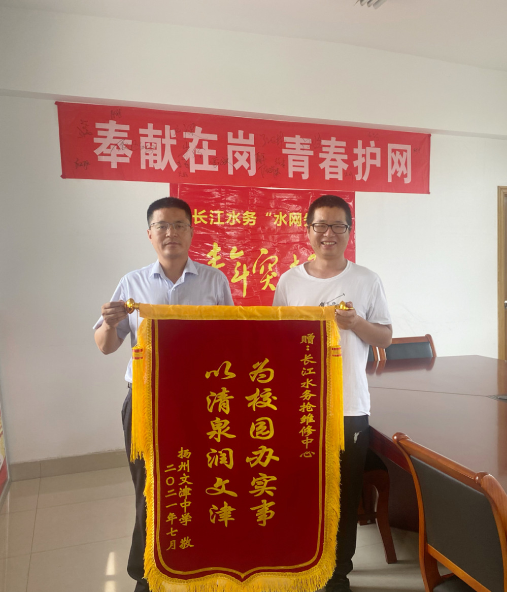 近日,文津中學為長江水務搶維修中心送來一面“為校園辦實事,以清泉潤文津”的錦旗,對長江水務“水網(wǎng)先鋒突擊隊”優(yōu)質高效解決學校用水難題表示衷心感謝。