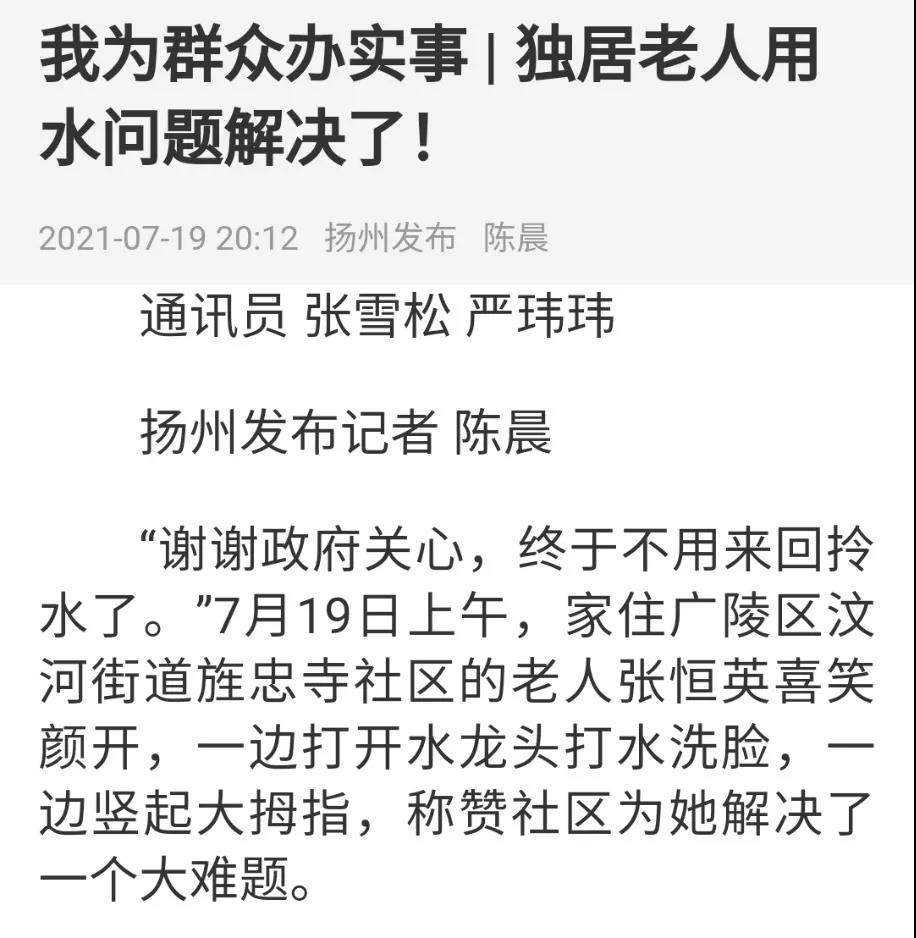 7月19日上午,家住廣陵區(qū)汶河街道旌忠寺社區(qū)的83歲獨(dú)居老人張恒英喜笑顏開,一邊打開水龍頭打水洗臉,一邊豎起大拇指,稱贊社區(qū)為她解決了一個大難題。