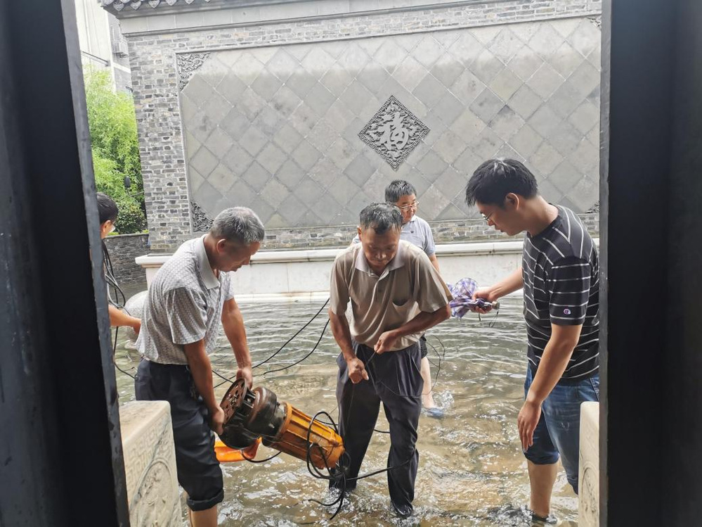 經(jīng)排查發(fā)現(xiàn)緊鄰國家級文物保護單位汪氏鹽商住宅周邊的南河下、省級文保單位蔚圃南側(cè)的風(fēng)箱巷出現(xiàn)嚴(yán)重積水情況,公司第一時間組織工作人員,攜帶抽水泵等設(shè)備進行抽水,最大程度降低暴雨對古宅的影響,確保國有資產(chǎn)的安全。
