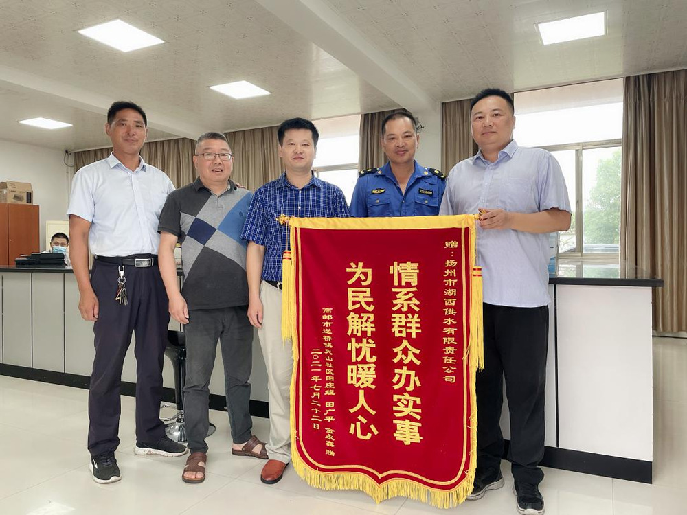 7月26日早晨,高郵市送橋鎮(zhèn)天山社區(qū)田莊組的居民冒著大雨,將一面寫有“情系群眾辦實(shí)事 為民解憂暖人心”的紅色錦旗送到長江水務(wù)湖西供水公司,感謝水務(wù)人解決了長期困擾他們的夏季水壓不足問題。