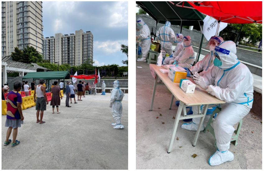 志愿者的臉龐遮掩在面罩與口罩下,身形隱藏于防護(hù)服和藍(lán)馬甲里,面對炎炎酷暑與疫情防控的雙重“烤”驗,化身居民“汗”衛(wèi)者,守好社區(qū)“安全線”。8月7日,志愿者服務(wù)隊接到支援廣?;▓@廣欣苑輔助核酸檢測、協(xié)助物資采購的任務(wù)。自此后的10天中,他們輔助該封閉小區(qū)開展核酸檢測,做好逐樓通知并維護(hù)核酸檢測點秩序,至今累計服務(wù)7次核酸檢測。他們還協(xié)助社區(qū)完成所轄區(qū)域內(nèi)居民信息核對,值守小區(qū)出入口,嚴(yán)格查驗體溫和“兩碼”,并幫助社區(qū)做好居民生活物資的預(yù)訂、采購和配送。