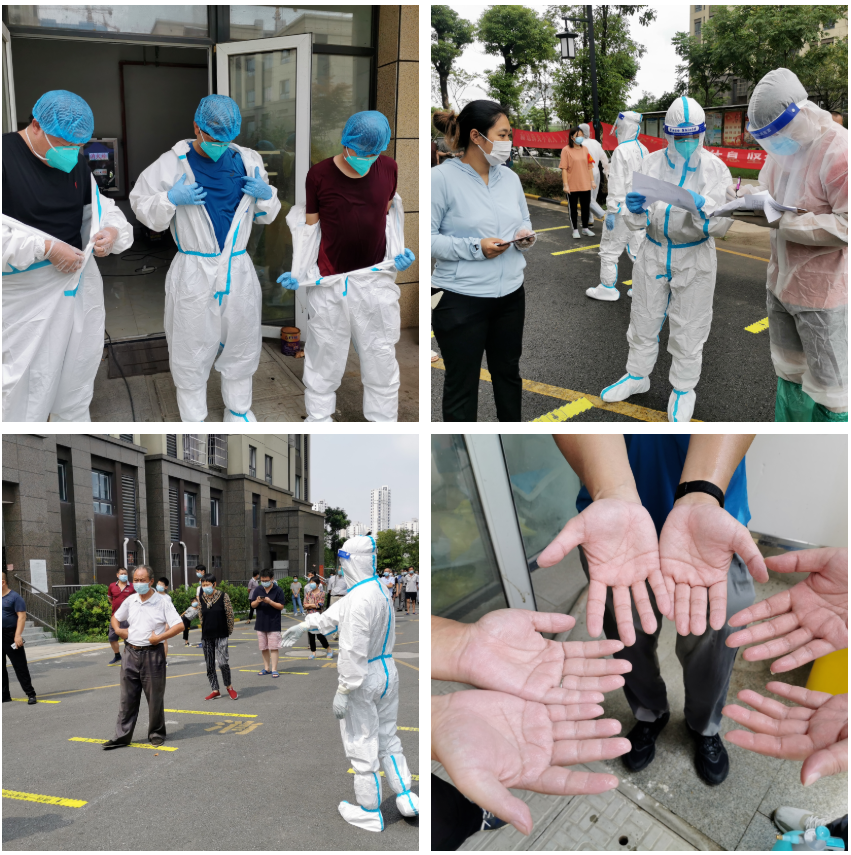 “幫我對照下防護服穿戴教學(xué)視頻,順序?qū)Σ粚??全部保護了沒有?”這是志愿者首次穿戴全套防護用具時忐忑的話語。初次接觸防護服,雖然前期教學(xué)培訓(xùn)過,但內(nèi)心期待中還有些許緊張,動作生疏卻很仔細,大家相互幫忙、相互學(xué)習(xí)、相互監(jiān)督,確保不留任何漏洞,檢測過程中,大家要做好測量體溫、核對人員信息、核查健康碼、提醒保持安全距離、幫助老弱病殘及特殊人群等工作,有時還要應(yīng)對暈厥的居民、易怒的群眾情緒以及少部分特殊群體的交流障礙,一次核酸檢測的時間大概在3小時左右,這樣高強度的工作環(huán)境,大家沒有任何怨言,除去防護服的那一刻,看著臉上深深的勒痕、滴水的上衣和發(fā)白的雙手,有的只是相視一笑,再次投身到小區(qū)封控管理工作中去。