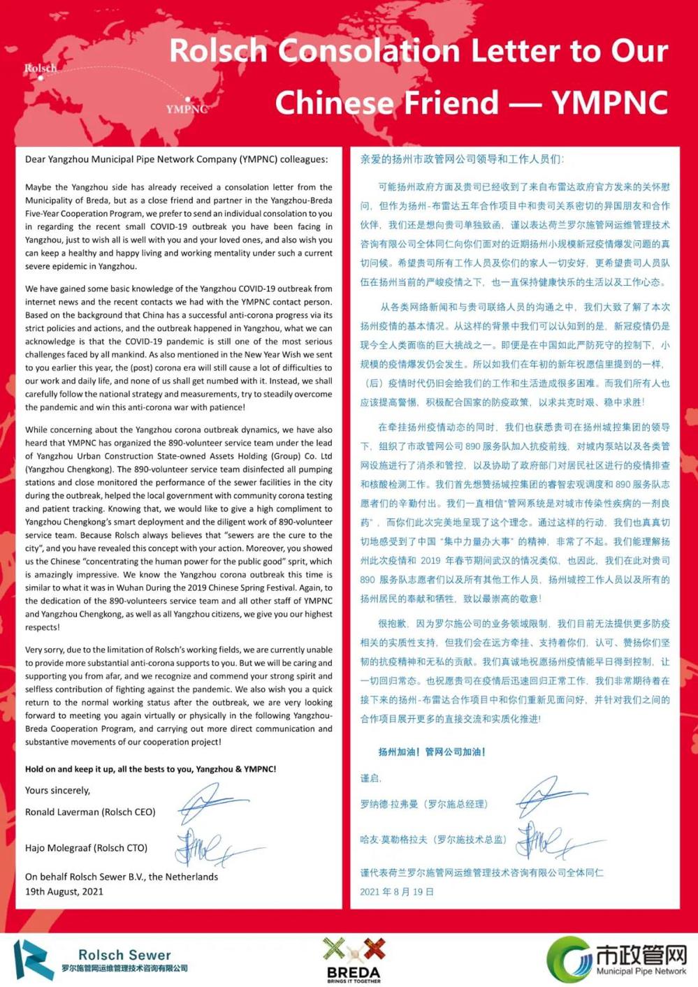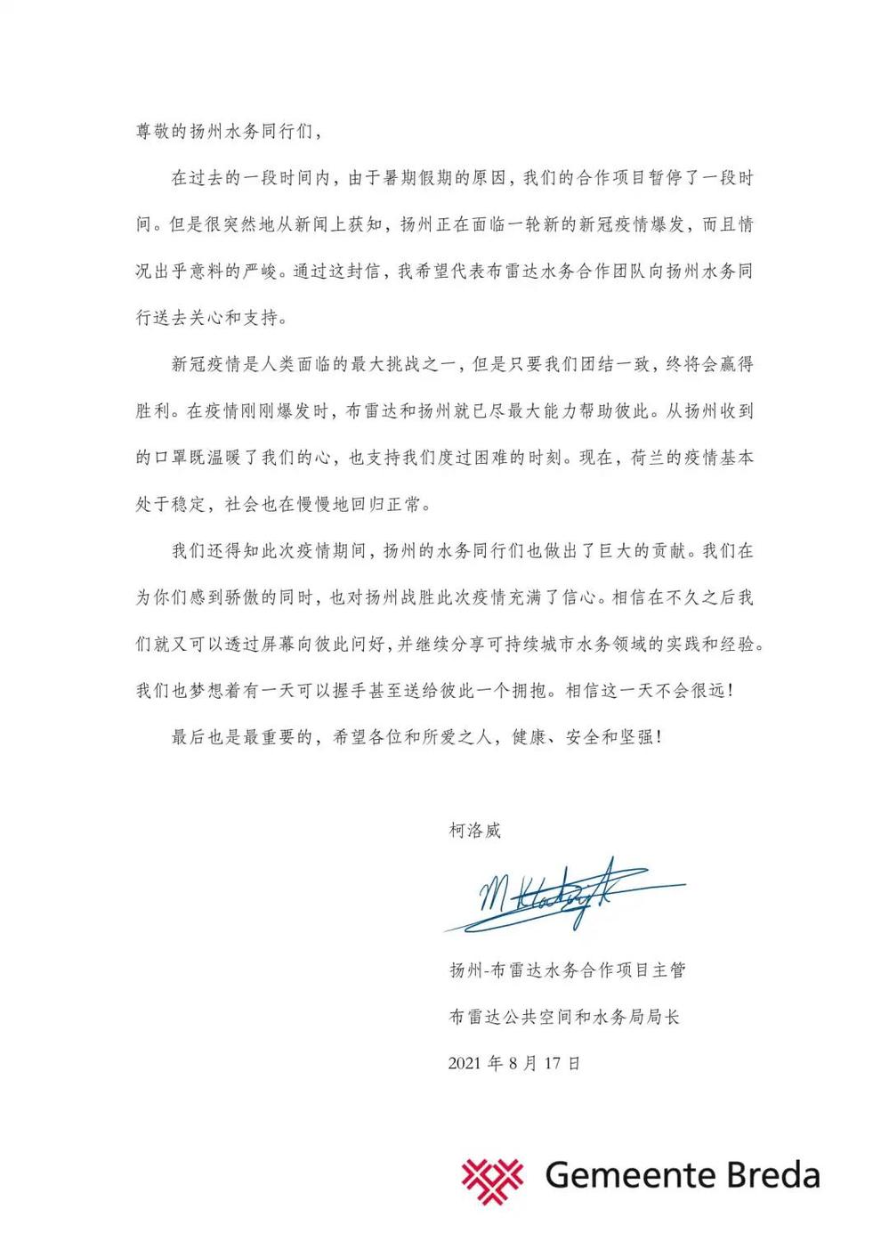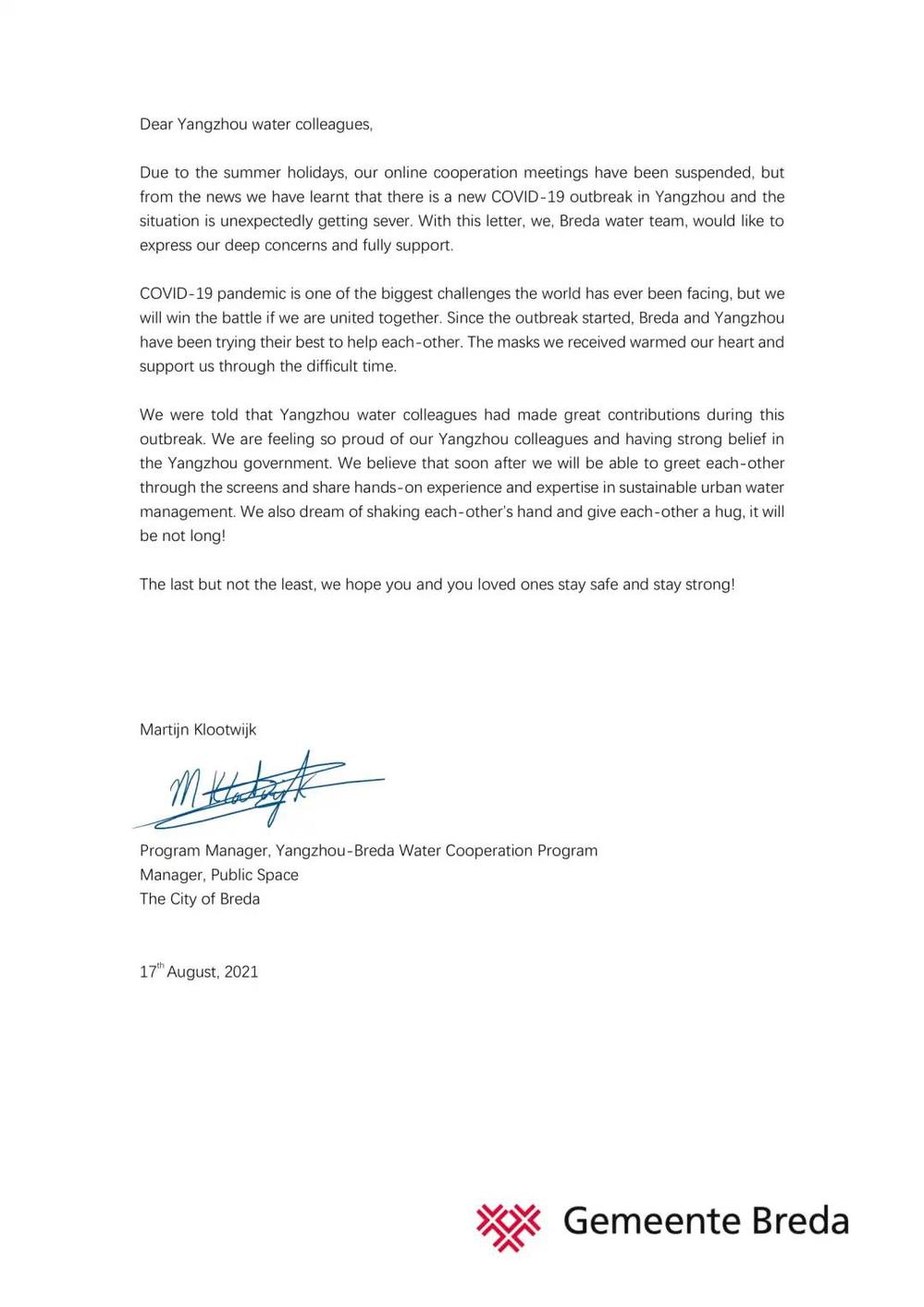 8月18日,在我市新冠肺炎疫情防控的攻堅時刻,城控集團(tuán)收到荷蘭布雷達(dá)市公共空間和水務(wù)局以及羅爾施管網(wǎng)運維管理技術(shù)咨詢有限公司發(fā)來的暖心慰問函。信函中,布雷達(dá)市公共空間和水務(wù)局局長馬丁·科洛威先生以及羅爾施管網(wǎng)運維管理技術(shù)咨詢有限公司總經(jīng)理羅納德·拉弗曼先生對我市正在蔓延的新冠肺炎疫情表示關(guān)切;向身處疫情中的廣大城控集團(tuán)員工及家人表示誠摯的問候,對“890管網(wǎng)服務(wù)隊”代表的“城控”抗疫志愿者奮戰(zhàn)“疫”線的擔(dān)當(dāng)精神,致以崇高的敬意。這封遠(yuǎn)隔重洋飛馳而來的慰問信,彰顯了兩座城市間彌足珍貴的友誼,也增強(qiáng)了“城控人”打贏這場疫情防控阻擊戰(zhàn)的信心。