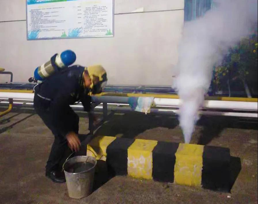 當(dāng)晚10時(shí)許,演練正式開始。只見場站內(nèi)濃煙滾滾,這是模擬卸車柱液相管發(fā)生管道泄漏。發(fā)現(xiàn)異常情況后,夜間值班人員背負(fù)正壓呼吸器,迅速趕到現(xiàn)場,在查看到泄漏點(diǎn)位置后,立即到安全區(qū)域向有關(guān)負(fù)責(zé)人報(bào)告。參演人員得到指令,按照預(yù)案奔赴現(xiàn)場,接上消防水帶,打開消防栓啟動(dòng)消防泵,調(diào)整蓮花頭,以霧狀水幕稀釋泄漏點(diǎn)周邊液化氣濃度。隨后,搶修人員趕到,用堵漏卡箍與濕布,對(duì)管道泄漏點(diǎn)進(jìn)行堵漏。堵漏完成后,對(duì)泄漏點(diǎn)檢測,確保無泄漏后,做進(jìn)一步處理。