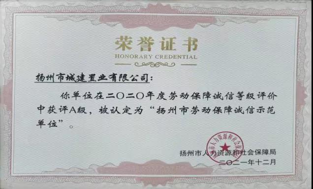 近日,揚(yáng)州市城建置業(yè)有限公司被授予“揚(yáng)州市勞動(dòng)保障誠(chéng)信示范單位”榮譽(yù)稱號(hào)。截至今年,已連續(xù)三年獲此殊榮。