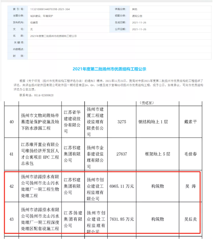 2021年底,揚(yáng)州市優(yōu)質(zhì)工程獎(jiǎng)“瓊花杯”獲獎(jiǎng)工程名單揭曉,揚(yáng)州市湯汪污水處理廠三期工程(26萬(wàn)噸/日污水處理、5.2萬(wàn)噸/日再生水利用工程)榮獲2021年度“瓊花杯”市政類(lèi)優(yōu)質(zhì)工程獎(jiǎng)。同時(shí),湯汪三期尾水管線工程、北山一期工程生物處理區(qū)工程、北山一期深度處理區(qū)及配套設(shè)施工程、北山一期尾水管線工程,4個(gè)項(xiàng)目均獲市文明工地稱(chēng)號(hào);北山一期工程生物處理區(qū)工程、北山一期深度處理區(qū)及配套設(shè)施工程,2個(gè)項(xiàng)目榮獲市優(yōu)質(zhì)結(jié)構(gòu)。