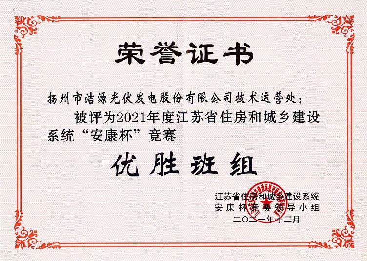 近日,光伏公司技術(shù)運(yùn)營(yíng)處在參加 2021年度江蘇省住房和城鄉(xiāng)建設(shè)系統(tǒng)“安康杯”競(jìng)賽活動(dòng)中,被評(píng)為“安康杯”競(jìng)賽優(yōu)勝班組榮譽(yù)稱號(hào)。