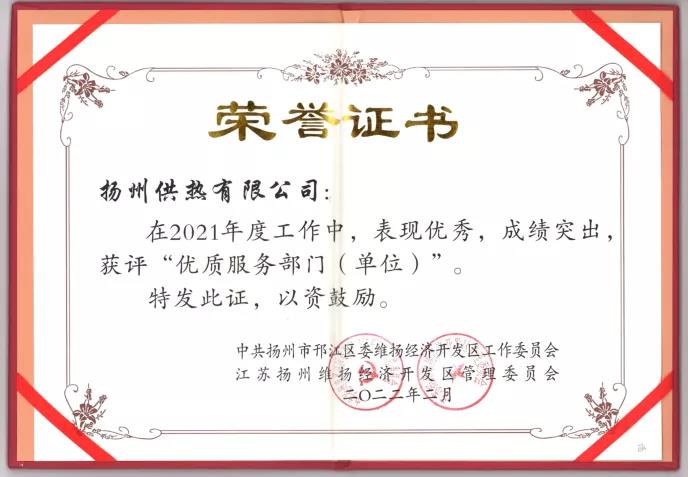 近日,在江蘇揚州維揚經(jīng)濟開發(fā)區(qū)2021年度經(jīng)濟社會發(fā)展先進集體和先進個人表彰大會上,供熱公司榮獲“優(yōu)質(zhì)服務單位”榮譽稱號。