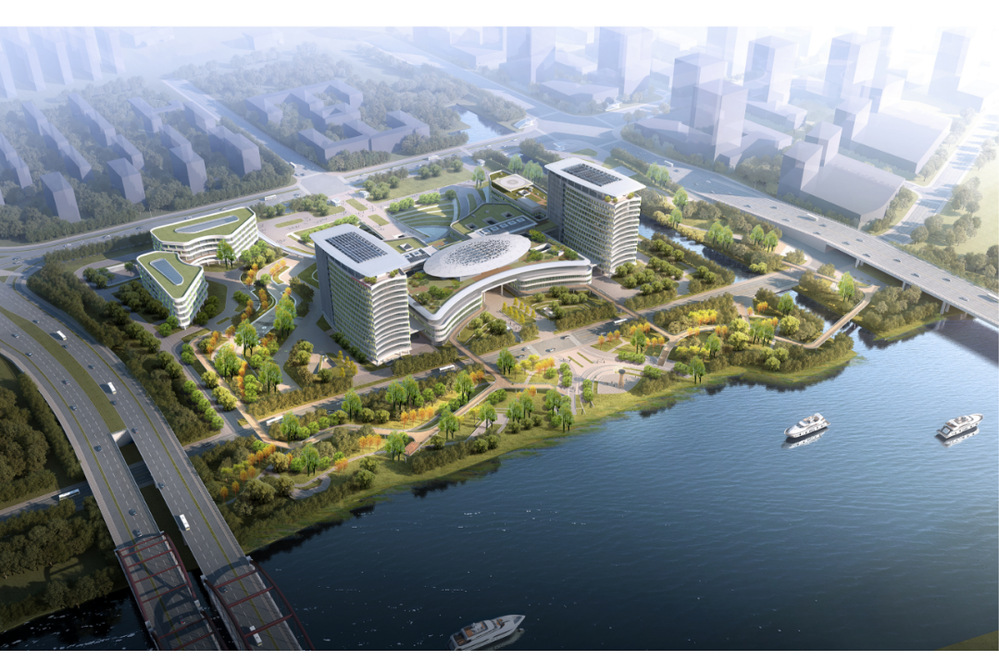 通過航拍鳥瞰,揚州頤和醫(yī)療健康中心整體造型已躍入眼簾?!胺秸趦?nèi),微弧于外”,醫(yī)技部上方鋼結構穹頂金屬華蓋日間反射日光閃亮矚目,建筑物西側(cè)濱水,弧形界面向運河空間打開,東臨新城,弧形連廊組織入口,向城市空間敞開,建成后的醫(yī)療中心必將會成揚州的名片,運河的明珠,婦女兒童的溫馨家園!