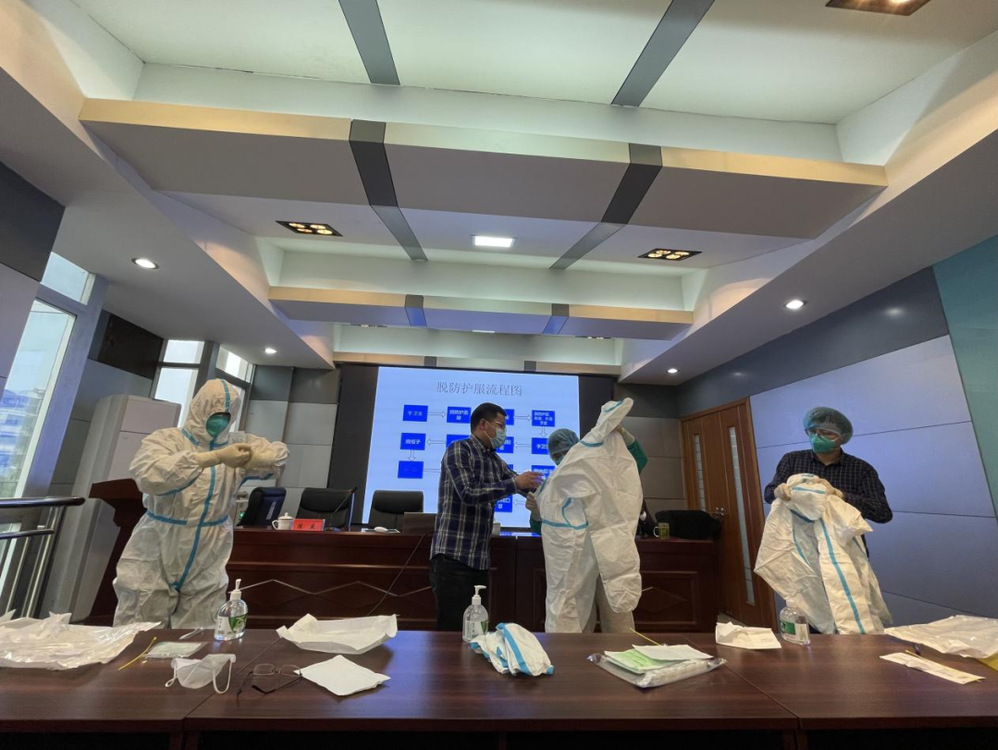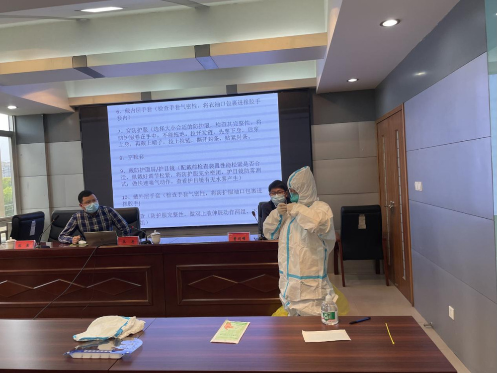 參加培訓(xùn)人員首先觀看了防護服穿脫流程演示視頻。隨后,市疾控中心人員介紹了正確穿脫防護服和規(guī)范使用防護用品的重要性、必要性及穿脫防護服的用物準(zhǔn)備,并對洗手步驟、穿脫步驟、防護及消毒處理步驟等方面進行了詳細(xì)講解與指導(dǎo),并現(xiàn)場進行了演示操作,隨后,參加培訓(xùn)人員在疾控中心專業(yè)人員指導(dǎo)下進行了實踐操作。