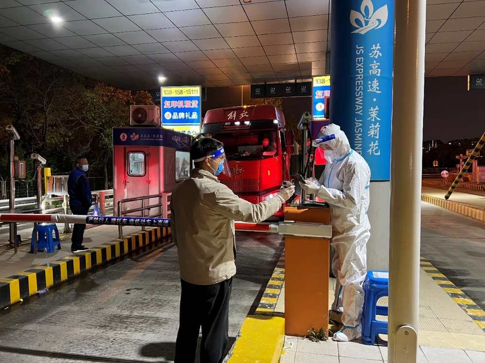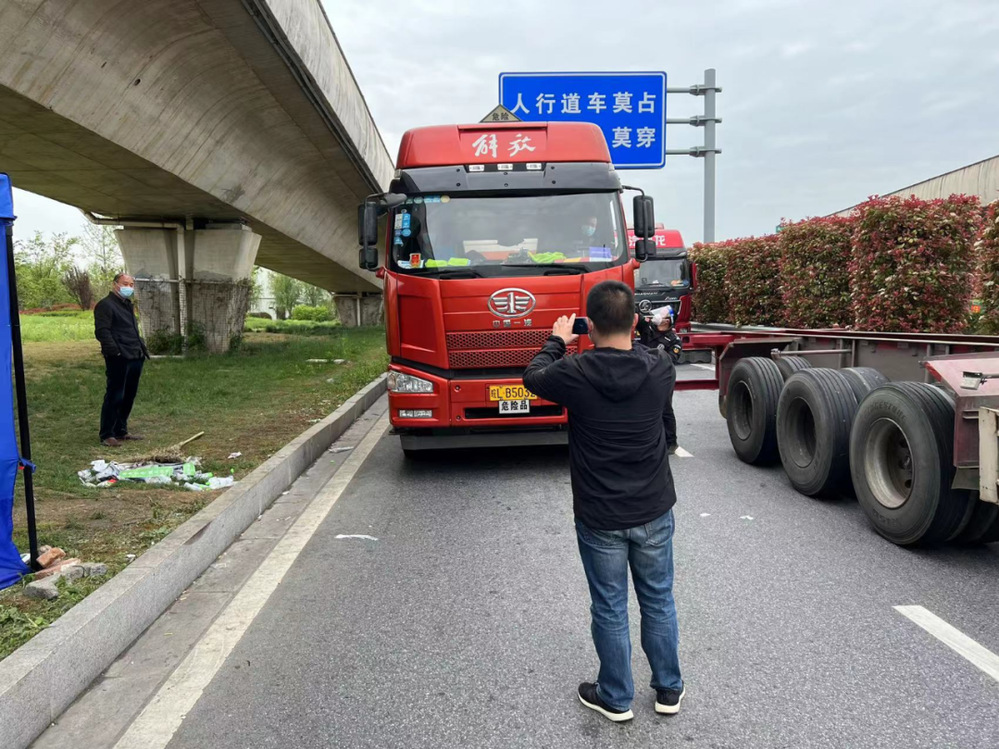 (生產(chǎn)運(yùn)行處董石語,在湯汪高速口接駁藥劑運(yùn)輸車輛,向查驗(yàn)點(diǎn)工作人員出示電子通行證)
