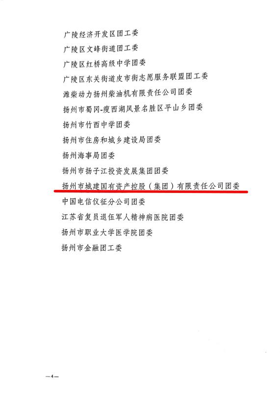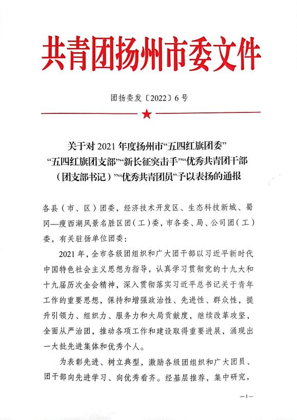 2022年是中國共青團(tuán)成立100周年。近日,揚州團(tuán)市委印發(fā)了《關(guān)于對2021年度揚州市“五四紅旗團(tuán)委”“五四紅旗團(tuán)支部”“新長征突擊手”“優(yōu)秀共青團(tuán)干部(團(tuán)支部書記)”“優(yōu)秀共青團(tuán)員”予以表揚的通報》(揚團(tuán)委發(fā)〔2022〕6號),城控集團(tuán)團(tuán)委被授予2021年度揚州市“五四紅旗團(tuán)委”稱號。
