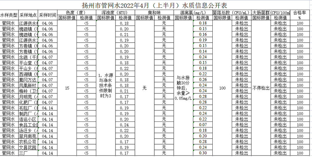 揚(yáng)州市管網(wǎng)水2022年4月(上半月)水質(zhì)信息公開(kāi)表