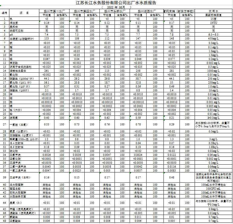 江蘇長(zhǎng)江水務(wù)股份有限公司出廠水水質(zhì)報(bào)告 ( 2022 年 06月 )