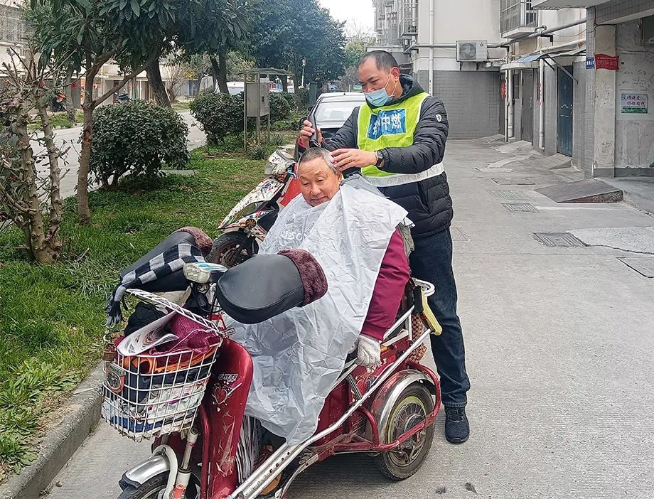 “我趕上好時候了,有中燃公司和社區(qū)的關懷,感到非常滿足”。許鴻林老人行動不便,是“藍焰老兵”結對幫扶對象。志愿者單成林邊理發(fā)邊與許老聊天,并按照他提出的要求認真細致地修剪,不一會兒,老人之前凌亂的頭發(fā)變得干凈整齊,許老臉上露出幸福的笑容。