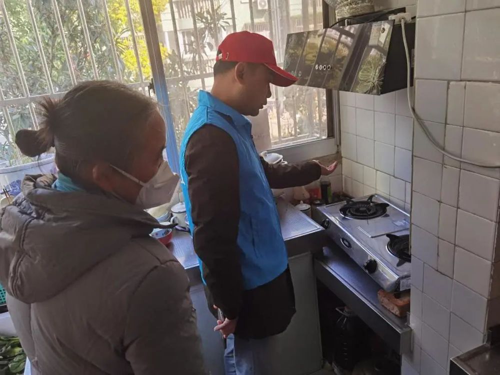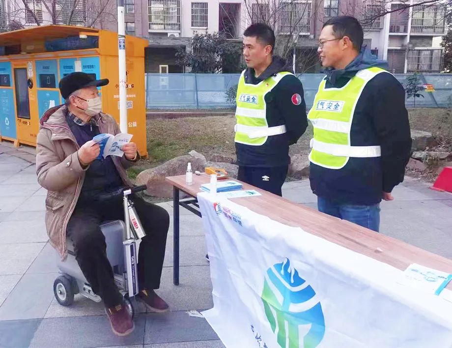 在社區(qū)廣場,志愿者們?yōu)樯鐓^(qū)居民發(fā)放燃氣安全使用手冊,講解燃氣安全使用知識及注意事項,走進孤寡老人家中開展燃氣安全檢查,免費更換不銹鋼波紋管。