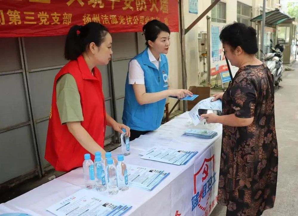 為充分發(fā)揮黨組織戰(zhàn)斗堡壘和黨員先鋒模范作用,進一步普及用電、用氣安全知識,7月24日上午,潔源光伏公司黨支部聯(lián)合揚州中燃公司第三黨支部前往石橋社區(qū)嘉豐苑小區(qū)開展“安全宣傳進社區(qū),共筑平安防火墻”志愿服務活動。