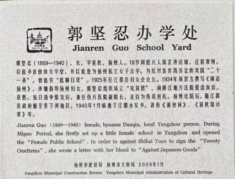 郭堅(jiān)忍的一生,恰似晚清至民國社會(huì)裂變的微觀縮影。當(dāng)揚(yáng)州城仍困于“三寸金蓮”的舊俗枷鎖時(shí),她已以不纏足會(huì)為刃,悄然剖開封建禮教的肌理;當(dāng)廣儲(chǔ)門故居的青磚灰瓦默立如常,其內(nèi)里早已成為女性掙脫閨閣的革命道場。這座看似尋常的民國建筑,實(shí)則是中國女性破繭成蝶的精神地標(biāo)——女學(xué)課堂的瑯瑯書聲與時(shí)代電波的滴答密語在此共振,將封建末世的挽歌,譜寫成一曲近代婦女解放的覺醒先聲。