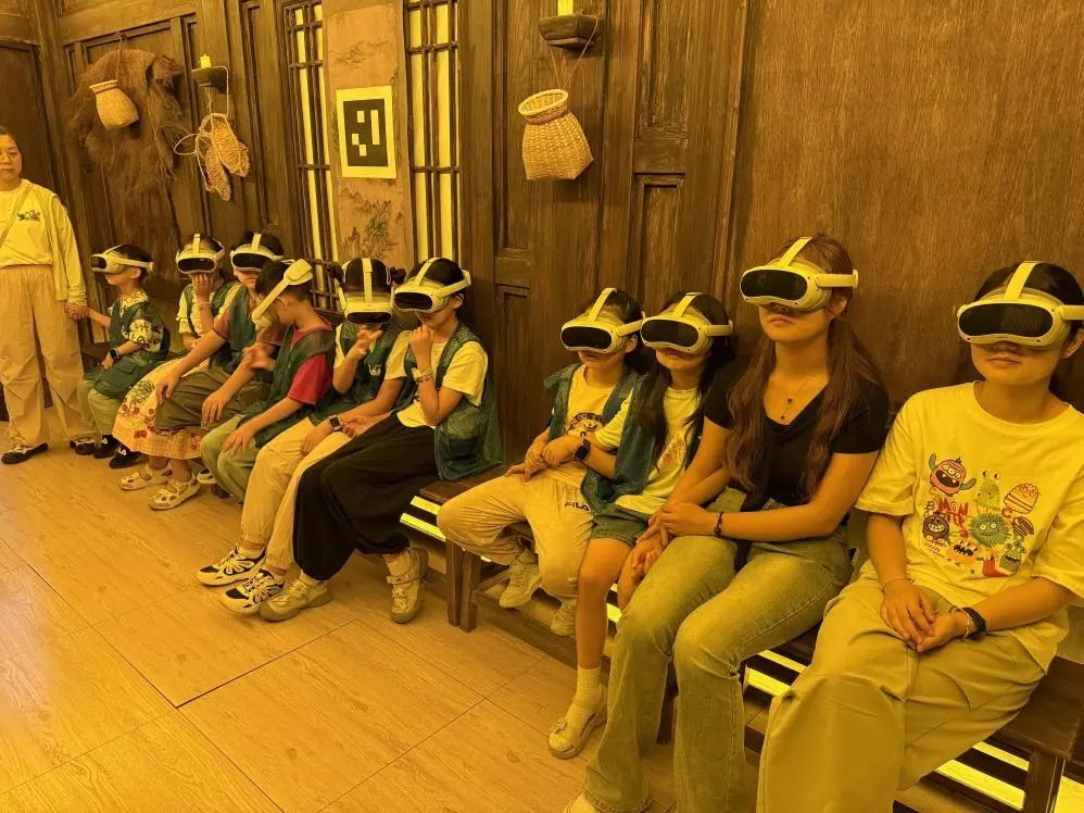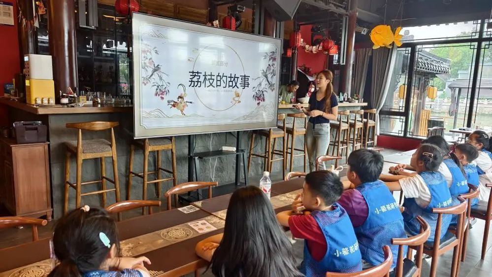 孩子們?cè)诶蠋煹膸ьI(lǐng)下走進(jìn)淮揚(yáng)菜博物館,從古籍記載的飲食習(xí)俗,到非遺傳承人的技藝展示,大家一邊觀察飲食文物,一邊聆聽講解,在互動(dòng)中了解到淮揚(yáng)菜與古代飲食文化的深厚關(guān)聯(lián)。緊隨其后的唐朝詭事錄VR劇場(chǎng)成為活動(dòng)高潮,孩子們戴上VR眼鏡,瞬間“穿越”至盛唐街頭,化身“小偵探”跟隨劇情線索探尋關(guān)于荔枝的謎題。虛實(shí)交織的場(chǎng)景、生動(dòng)有趣的互動(dòng),讓抽象的歷史故事變得可感可觸?;顒?dòng)尾聲,孩子們圍坐一堂開啟“荔枝課堂”,老師從杜牧“一騎紅塵妃子笑”的詩句切入,講解荔枝的歷史典故、生長特性與文化寓意,讓孩子們?cè)谠娫~與美食的碰撞中深化認(rèn)知。最后,孩子們親手將新鮮荔枝制成清甜飲品,在動(dòng)手過程中體會(huì)“勞動(dòng)創(chuàng)造美味”的樂趣。