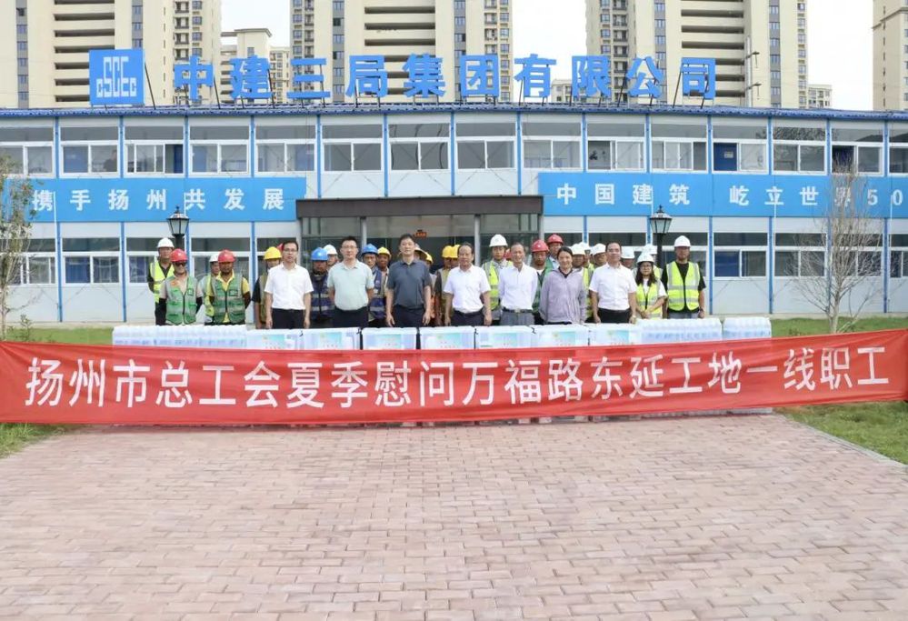 七月流火,熱浪灼人。7月15日下午,揚(yáng)州市總工會(huì)孫凌雷副主席率隊(duì)前往萬(wàn)??焖俾窎|延建設(shè)工程項(xiàng)目,走訪慰問(wèn)高溫下堅(jiān)守一線的施工人員,開(kāi)展夏季高溫“三送”活動(dòng)。城控集團(tuán)直屬聯(lián)合基層工會(huì)主席徐紫月、上善公司主要負(fù)責(zé)人參加活動(dòng)。