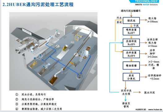 處理設(shè)備采用固體分類和固液分離技術(shù),通過洗滌轉(zhuǎn)鼓裝置與洗砂裝置的協(xié)同作業(yè),將通溝污泥中的粗大物質(zhì)、細(xì)砂及砂粒有效分離。其中,粗大物質(zhì)被輸送至垃圾處理設(shè)施,細(xì)砂得以回收再利用;濾出的污水則經(jīng)過精細(xì)過濾裝置和旋流分離一體化裝置的進(jìn)一步處理后,排放至污水處理廠。整套流程實(shí)現(xiàn)了通溝污泥的減量化、穩(wěn)定化、無(wú)害化和資源化。