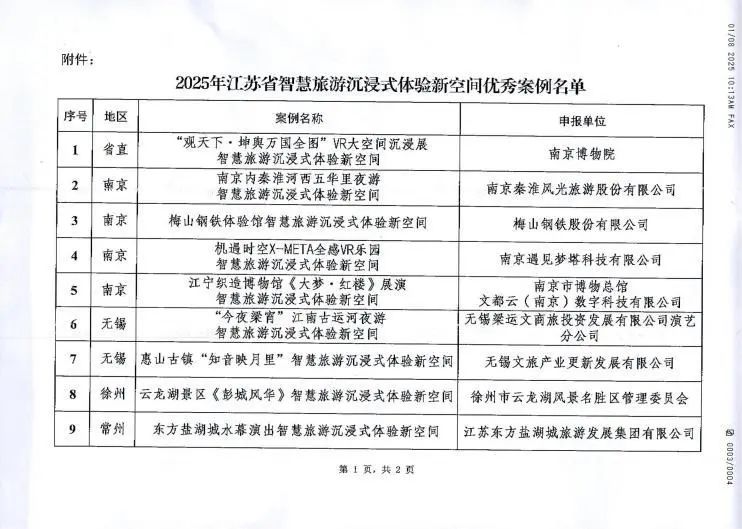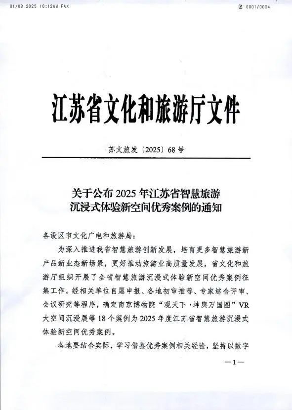 在近日江蘇省文化和旅游廳公布的《2025年江蘇省智慧旅游沉浸式體驗(yàn)新空間優(yōu)秀案例名單》中,揚(yáng)州《唐朝詭事錄·西行》國(guó)潮沉浸劇場(chǎng)與南京博物院“觀(guān)天下·坤輿萬(wàn)國(guó)圖”VR大空間沉浸展等18個(gè)案例共同被評(píng)選為2025年江蘇省智慧旅游沉浸式體驗(yàn)新空間優(yōu)秀案例。