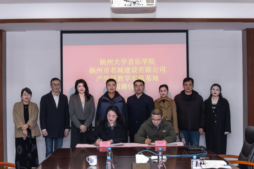 近日,揚(yáng)州市名城建設(shè)有限公司與揚(yáng)州大學(xué)音樂(lè)學(xué)院“產(chǎn)學(xué)研教學(xué)實(shí)踐基地” 簽約揭牌儀式在原古城保護(hù)展示館舉行。揚(yáng)州市名城建設(shè)有限公司黨總支書(shū)記、總經(jīng)理戴興春,揚(yáng)州大學(xué)音樂(lè)學(xué)院黨委書(shū)記陸濤、院長(zhǎng)邵萍及相關(guān)負(fù)責(zé)人出席儀式。